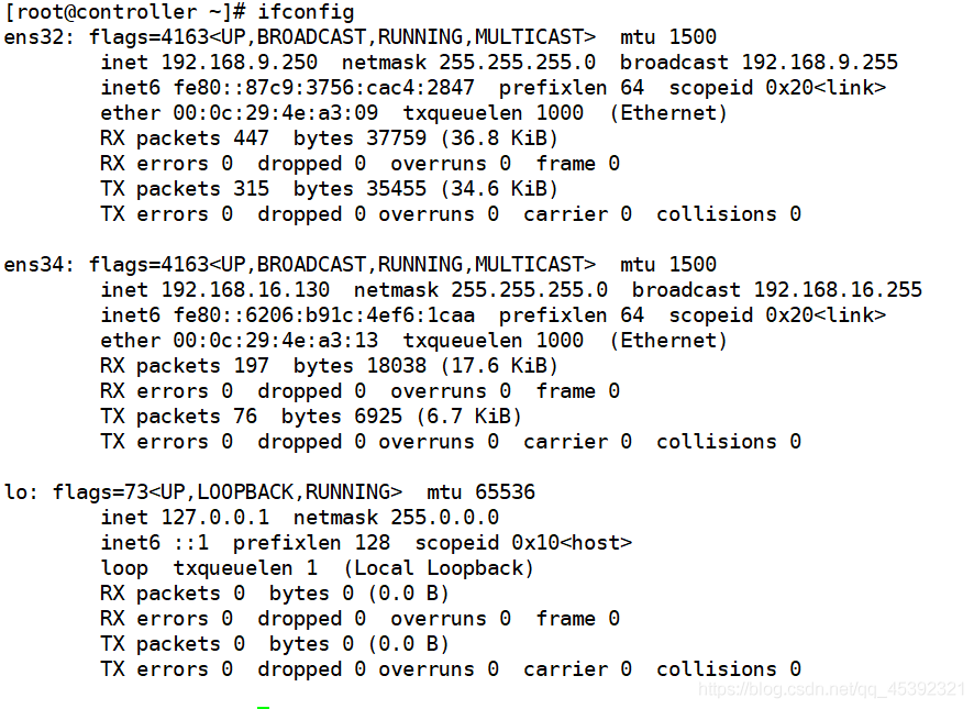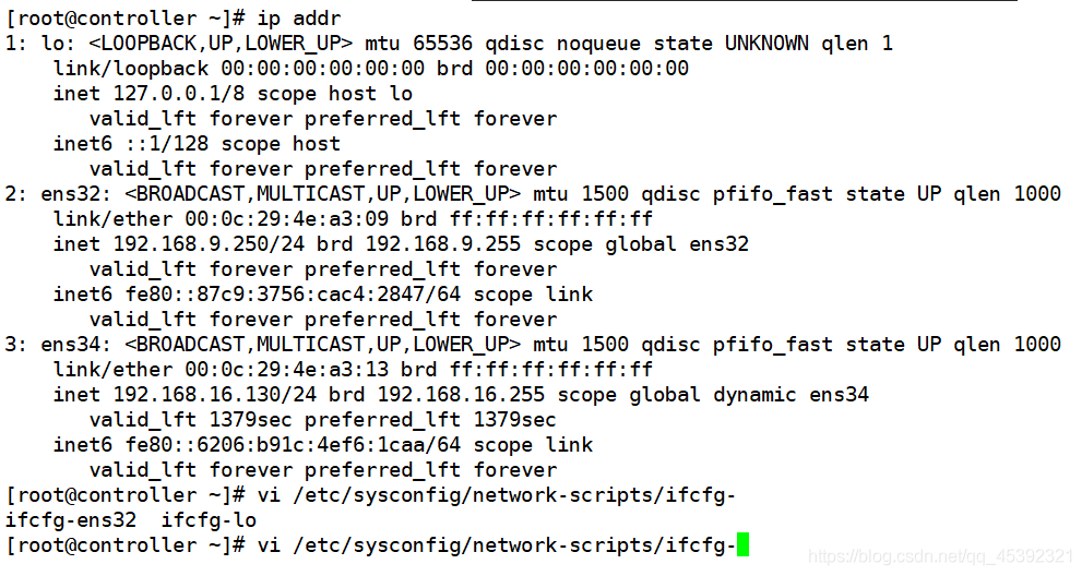 进入# cd /etc/sysconfig/network-scripts/目录下,找到原来的网卡,将其复制并更名。 [root@controller network-scripts]# cp ifcfg-ens32 ifcfg-ens34 修改ens34网卡的参数信息。即修改NAME、UUID、DEVICE [root@controller network-scripts]# vi ifcfg-ens3 ifcfg-ens32 ifcfg-ens34 [root@controller network-scripts]# vi ifcfg-ens34 [root@controller network-scripts]# cat ifcfg-ens34 TYPE=Ethernet BOOTPROTO=static DEFROUTE=yes PEERDNS=yes PEERROUTES=yes IPV4_FAILURE_FATAL=no IPV6INIT=yes IPV6_AUTOCONF=yes IPV6_DEFROUTE=yes IPV6_PEERDNS=yes IPV6_PEERROUTES=yes IPV6_FAILURE_FATAL=no IPV6_ADDR_GEN_MODE=stable-privacy NAME=ens34 UUID=3de84f87-e49f-3bf8-8971-a496c2d92030 DEVICE=ens34 ONBOOT=yes IPADDR=192.168.16.128 PREFIX=24 GATEWAY=192.168.16.1 DNS=192.168.16.1 最后,重启网络即可。 [root@controller ~]# systemctl restart network