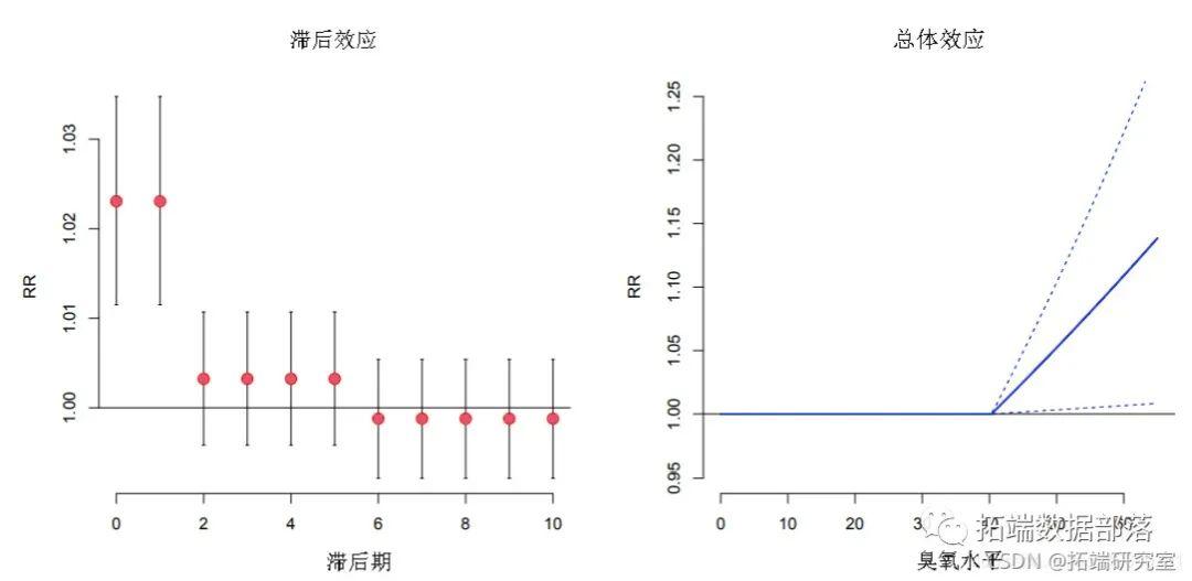 pre.o <- crosspred(basis, odel at = c(0:6,0., .3))传递给crosspred()的前两个参数是“ crossbasis”类的对象和用于估计的模型对象。像上面的第一个示例一样,可以通过at参数直接指定必须为其预测效果的暴露值向量。在这里,我选择了臭氧中从0到65 µgr / m3的整数,再加上所选阈值的值和10个单位以上的值(分别为40.3和50.3 µgr / m3)。然后,该函数调用crossbasis()来构建预测基准,并根据模型中的参数生成预测效果和标准误差。结果是“ crosspred”类的列表对象,该对象存储了预测的效果。它包括滞后效应矩阵和总体效应向量,以及相应的标准误差矩阵和向量。如第5节所示。例如,臭氧增加10个单位的总体效果表示为RR和95%置信区间,可以通过以下公式得出: