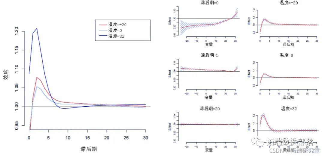 这些图表显示了高温和低温影响的不同模式,高温的影响非常强烈且迅速,低温影响更为延迟,在最初的滞后中为负。