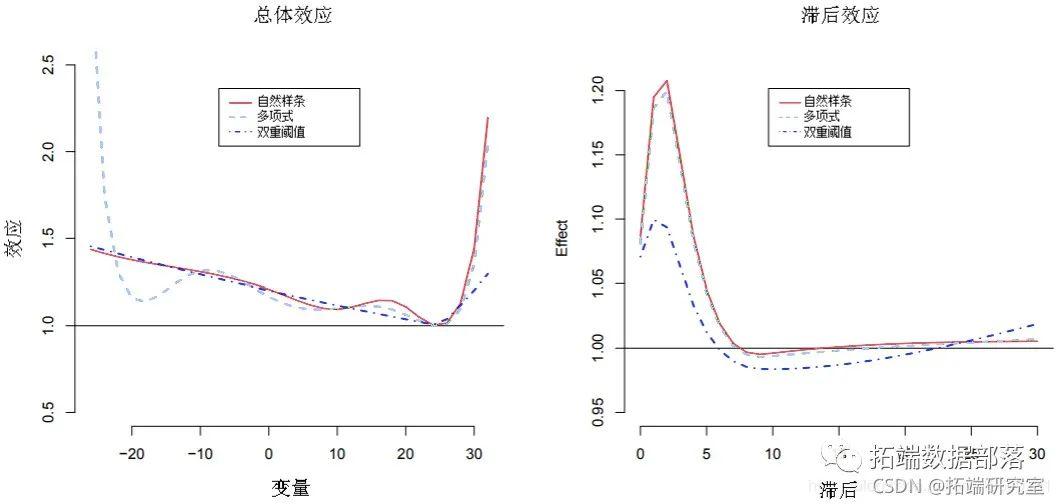 + col = 2:4, lty = c(1:2, 4), lwd = 1.5, inset = 0.1, cex = 0.8)正如预期的那样,替代模型会产生不同的结果。特别是,如果与具有等距结点的三次样条进行比较,则多项式模型会估计出低温的“摆动”关系。取而代之的是,这两个函数提供了非常接近的高温影响估算值。相反,虽然双阈值模型的线性假设似乎足以模拟低温的依赖性,但有一些证据表明,这种方法往往会低估热的影响。估计的分布滞后曲线的第二次比较如图4所示(右),如下所示: