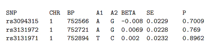 这部分数据,主要是大样本得到的特定性状的GWAS结果,GWAS summary result,包括snp,染色体,物理位置,maf,effect(或者OR),P值等信息,类似: