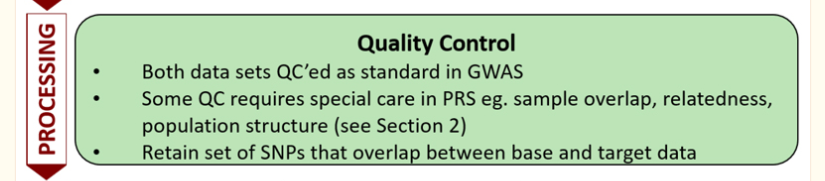 具体而言,在进行处理数据前,需要确定性状的遗传特性h2snp 要大于0.05,文件中确定定位基因,对maf和去填充准确性得分进行质控,两个数据基因组版本一致,对于基因型不匹配的可以通过flip翻转,重复的snp删除,性染色体删除,重复样本删除,对于基础数据和目标数据中有交叉的个人删除,亲缘关系近的也删除,确保基础数据和目标数据独立,等操作。