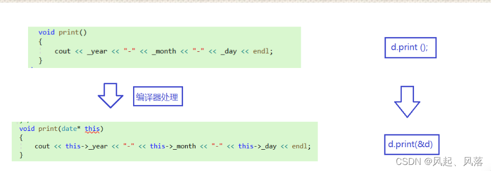 通过隐含的this指针,找到类中的私有 _year _month _day(在类中私有可以直接调用) 从而求出结果