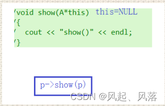 }因为printA和show函数都在公共代码段中,所以p->printA()和p->show()不会去p所指向的对象中寻找,这里不会崩溃