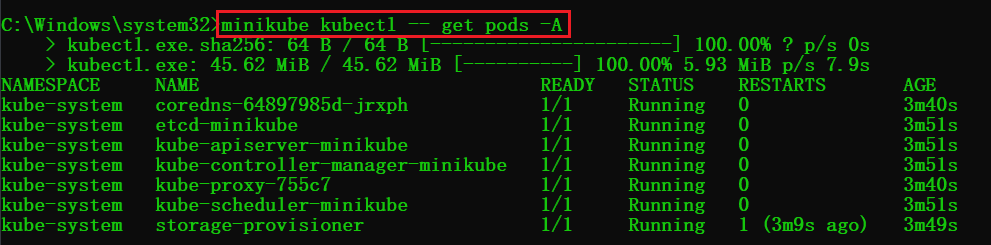 C:\Windows\system32>minikube kubectl -- get pods -A
