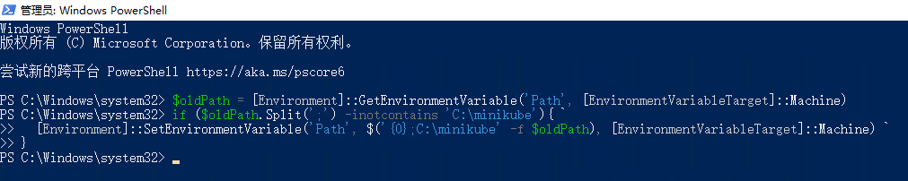 [Environment]::SetEnvironmentVariable('Path', $('{0};C:\minikube' -f $oldPath), [EnvironmentVariableTarget]::Machine) `