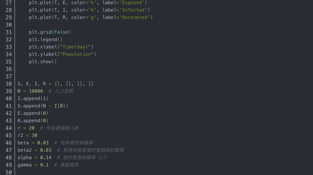 r:感染患者(I)每天接触的易感者数目;β:传染系数,由疾病本身的传播能力,人群的防控能力决定;γ:恢复系数,一般为病程的倒数,例如流感的病程5天的话,那么它的γ就是1/5;α:潜伏者的发病概率,一般为潜伏期的倒数。