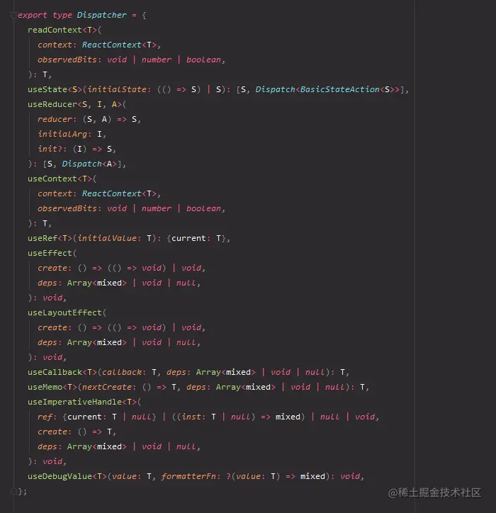 };看看 Dispatcher,都是和 React Hooks 相关的。