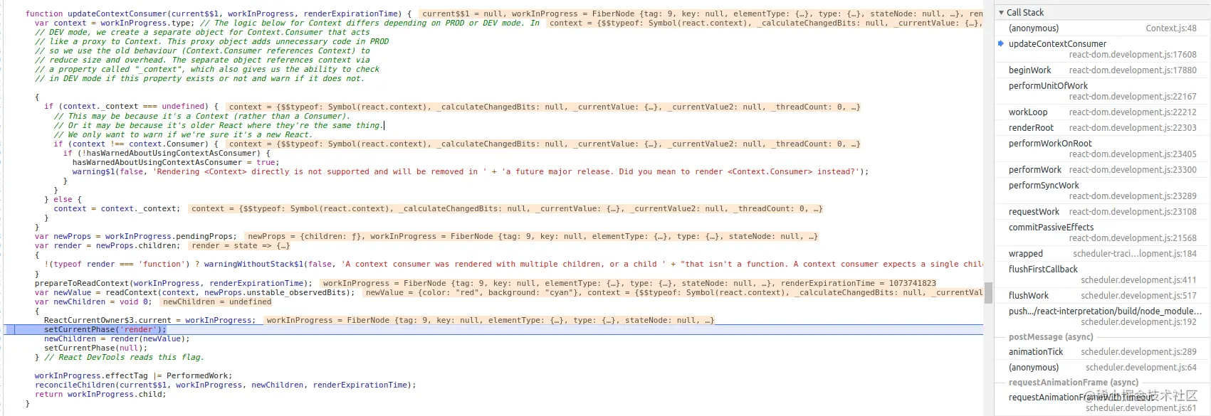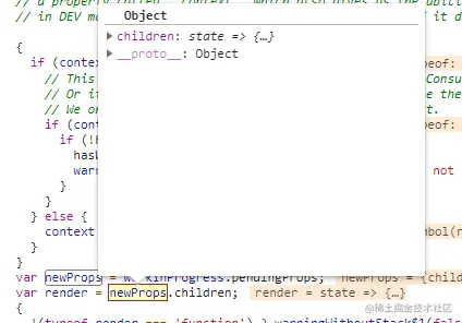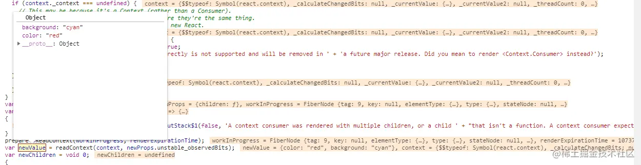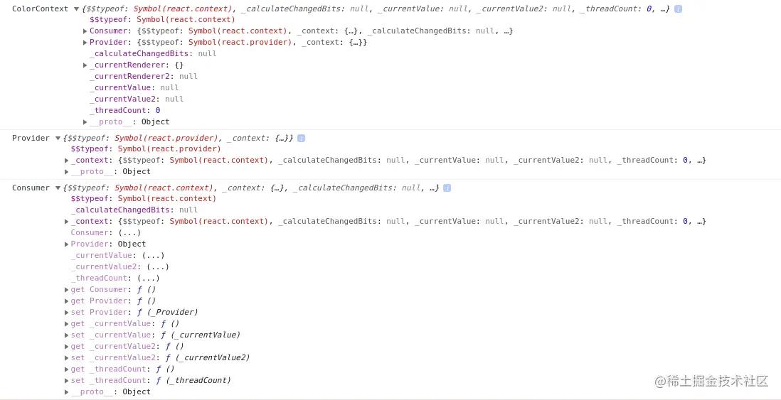 };所以可以做一个猜想, Provider 的 value 属性赋予的新值肯定通过 _context 属性传到了 context 上,修改了 _currentValue。同样,Consumer 也是依据 _context 拿到了 context 的 _currentValue,然后 render(newValue) 执行 children 函数。