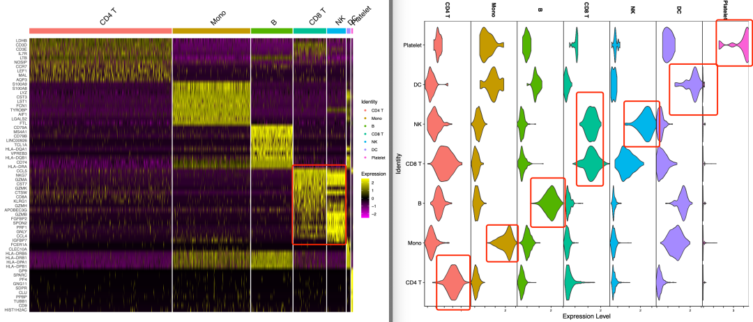 可以看到,两个CD4的T细胞其实大量共享高表达量基因,两个单核细胞也是如此,而CD8和NK也是如此: