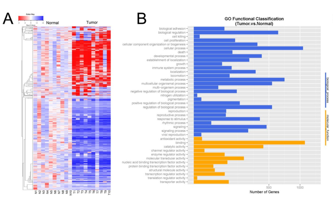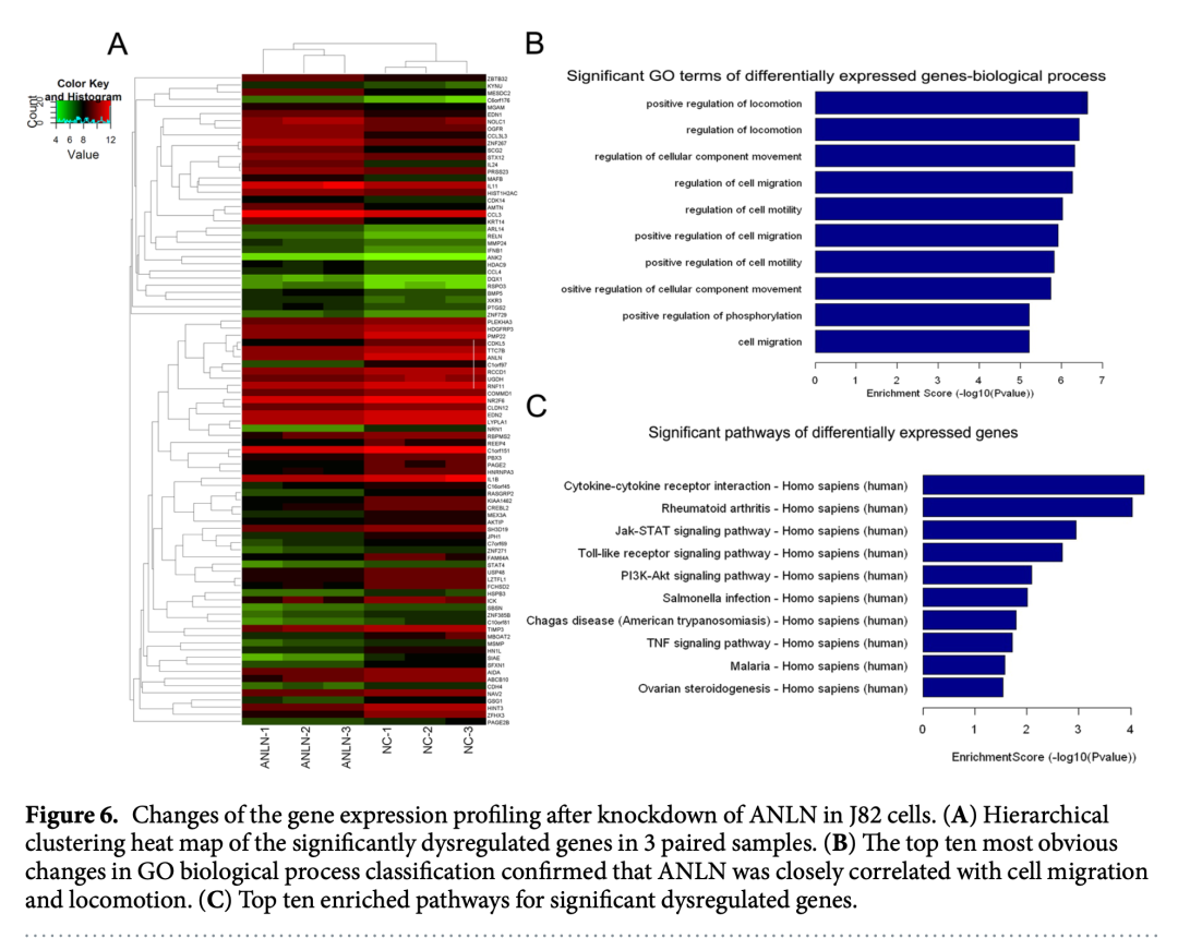 得到了:34 significantly up-regulated and 57 down-regulated genes in ANLN group compared with corresponding control group were selected for GO analysis and pathway analysis (Fig. 6A).