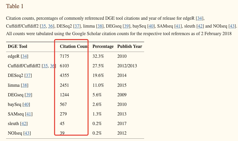 简单的搜索了一下,有一个2019的转录组测序后的表达量矩阵的差异分析方法综述:《Interpretation of differential gene expression results of RNA-seq data: review and integration》,当时里面汇总的这些软件的引用率都没有破万,如下所示: