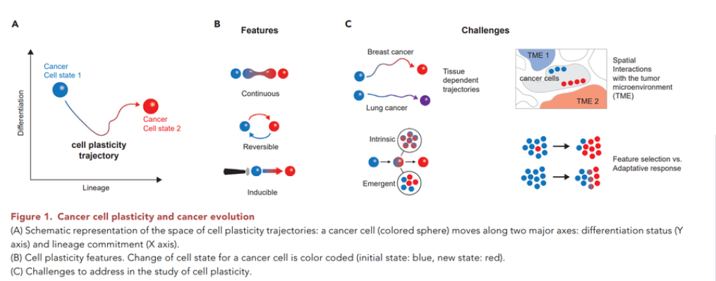 EMT的去分化状态可以使细胞获得干细胞特征并产生新的CSC,并且这种可塑性的进化过程可以从细胞形态的变化上展示。可塑性特征可能取决于起源细胞、致癌变异、与肿瘤微环境的相互作用以及治疗干预。此外,随着癌细胞群朝着实现不同目标的方向发展,可能需要进化权衡。