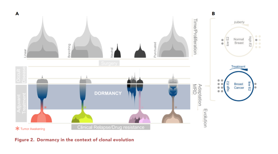 ERα 乳腺癌细胞会适应治疗,同时利用非遗传机制在最小残留疾病阶段处于休眠状态。这提倡对激素依赖性癌症的突变时间线进行改进,恢复增殖将恢复更传统的突变过程,从而为达尔文进化提供支持。