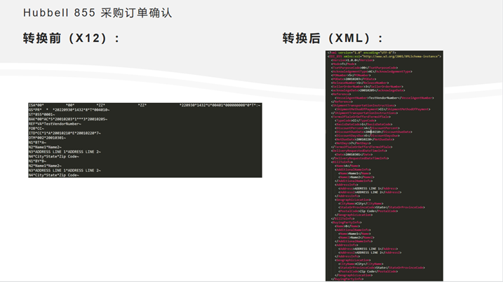 下图为Hubbell EDI X12 855示例报文转换前及经过知行之桥EDI系统转换后的结果对比图。