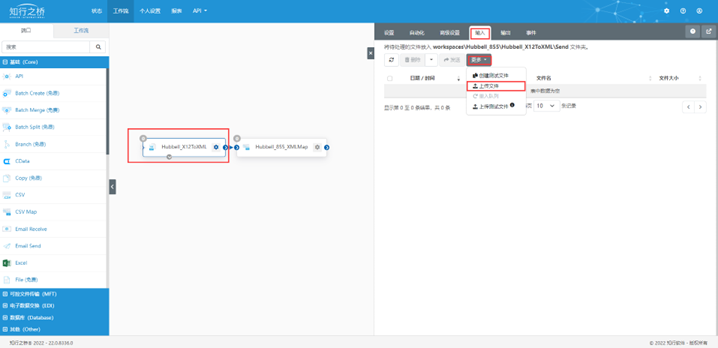 ③点开Hubbell_855_X12ToXML端口,点击上方 输入 ,在 更多里点击上传文件,上传Hubbell_855_Sample.x12。