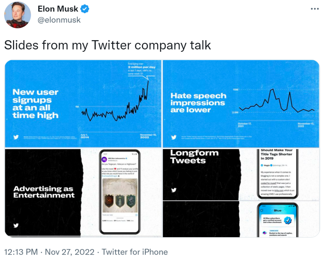 除了推特继续招人的消息之外,我们从 PPT 中还能看到马斯克在自夸最近一段时间经营公司的进展:社交网络上的仇恨言论印象有所下降。
