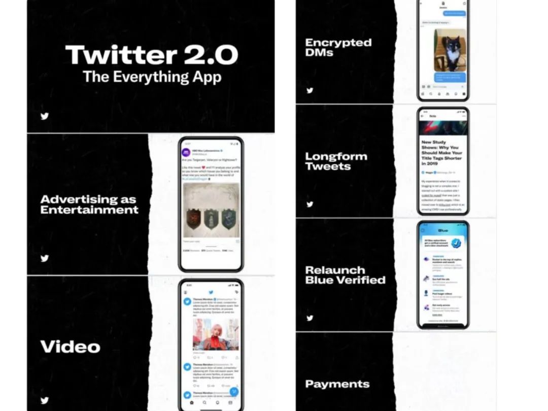 这样的思想在最新的「推特 2.0」PPT 里似乎得到了验证,其中提到新的功能包括长推文、视频、支付、加密的私信、蓝标认证优化,以及广告服务等。