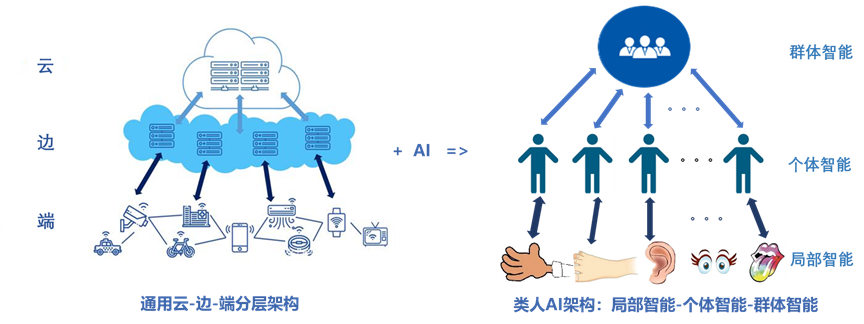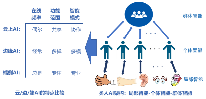 我们认为可以这么来看,局部智能、个体智能、群体智能来对应端/边/云的AI。