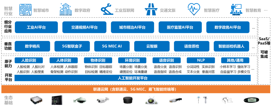 我们是以联通云网为基础,联合内外部软硬件生态,打造自主可控的AI能力平台,助力千行百业数字化转型。目前已具备1个开发平台、50多项原子能力、6类以上垂直功能和N种细分行业AI应用,并通过联通云、5GMEC、雁飞智能终端等提供云、边、端AI产品服务。