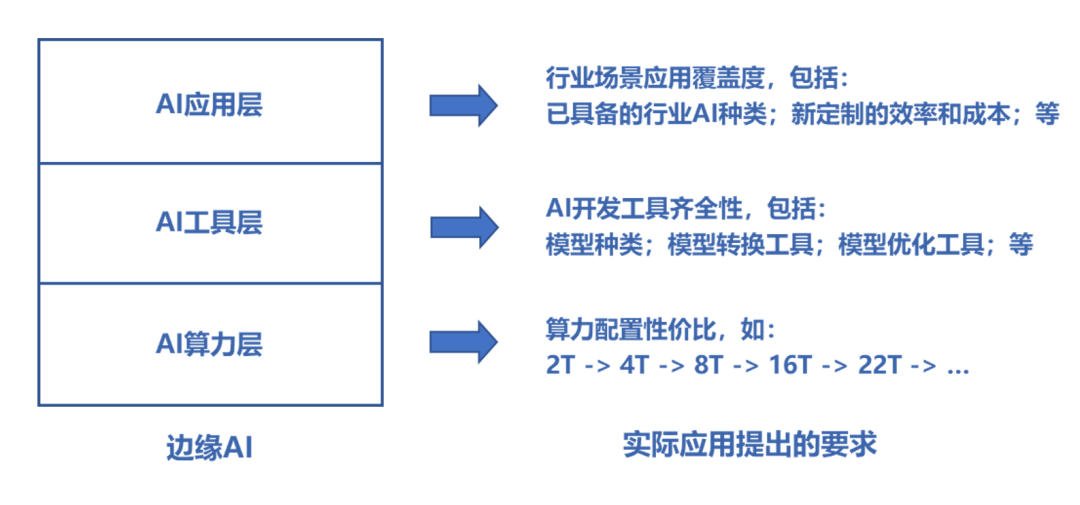 基于以上的对标,边缘AI对应到个体智能,实际的应用会对它提出什么样的要求呢?我们通过大量的实践,包括刚才的范式对标,我们会看到对于AI算力,从算力层、工具层和应用层都会有相应的要求。