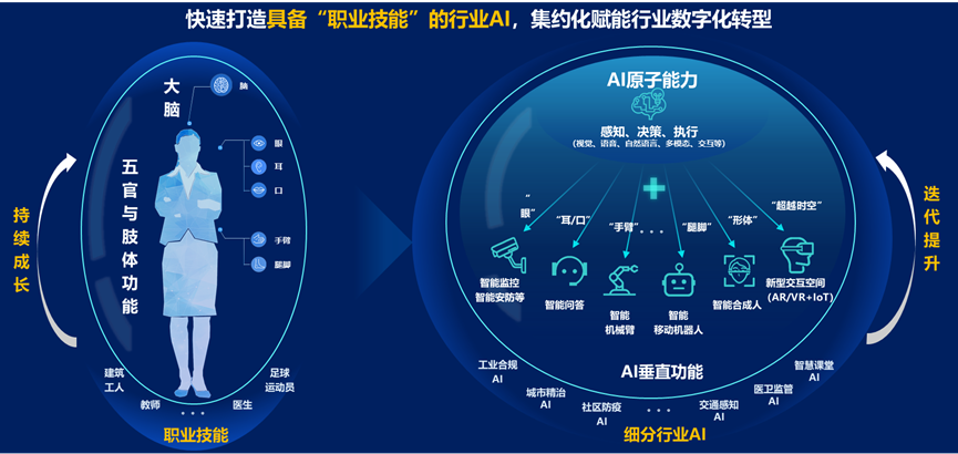 针对个体智能,我们提出了面向行业应用场景,快速打造“职业技能”。我们用人体来做类比,人具有大脑和肢体功能,这些都是差不多的,人与人之间的差异不是很大,但是职业技能差异就很大了。大家在各个行业里不断的强化,产生了分化,有人擅长当老师,有人擅长当建筑工人,有人擅长踢足球等等,分工不同形成了不同的职业技能,而且职业技能可以不断的迭代提升。