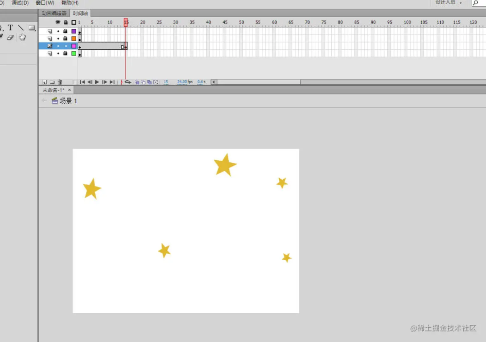 我们以 15 帧为一个单位每 15 帧闪烁一次,我们在 15 帧的位置上按 f6 就是复制前一帧,这个时候我们要注意一下如果你把其他图层锁定,只留了星星你再点击 15 针的时候按 f6 那么在 15 章只会显示星星其他背景,楼房白云都不会显示,因为他复制前一帧,复制的是那一行的第一针不是所有行也就是单个图层的第一帧只要离开那个图层,点击其他图层所在的帧就算是锁定的图层,也可以复制。