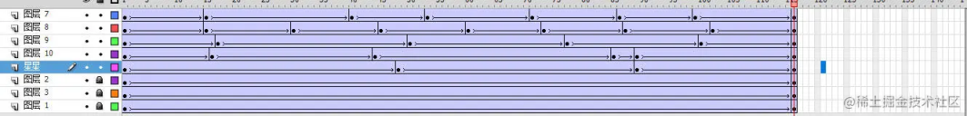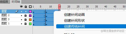 在第五帧到第十帧中间再按 f6 复制前一帧,将星星图层所有的星星改变大小,并且适当旋转旋转角度最好不要大于 45 度否则在几针的时间内旋转太快就不太真实,把所有的针全部选中右键创建传统补间。