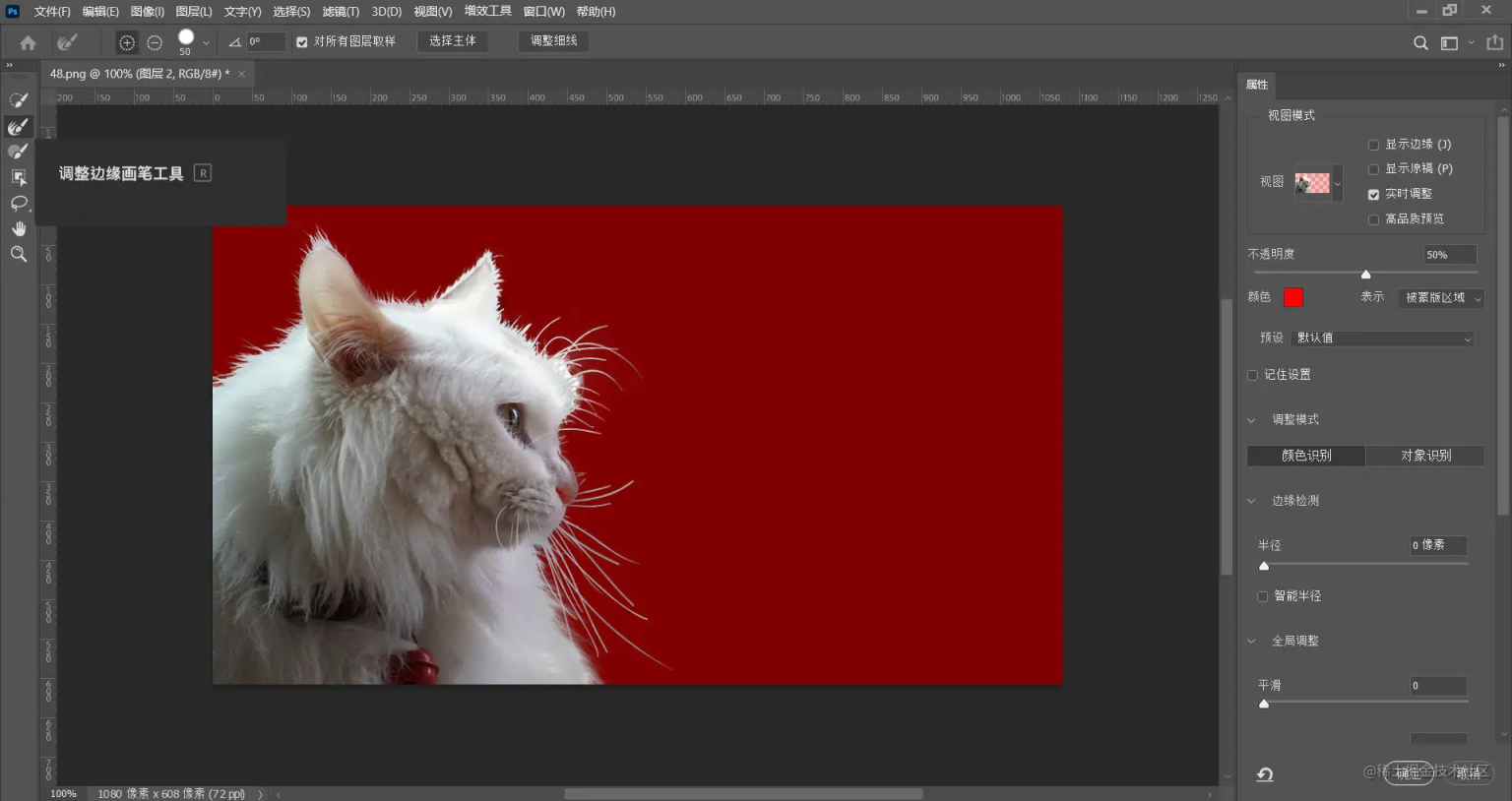 调整边缘画笔工具,快捷键 R,去选择并遮住中最重要的工具,调整边缘画笔工具和背景橡皮擦的原理差不多,我们选中他调整一下画笔大小,调整边缘画笔工具没有取样点的概念,取代这一点的是该工具的智能识别,所以我们就可以在毛发外中心点,在实体范围之外涂抹一圈边缘的毛发,就会显现出来,但中心点不能过于靠近或直接进入实体,如果只扣一个单独图层,不需要勾选对所有图层取样