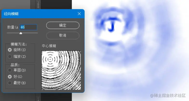 经向模糊是一个由中心向外环形扩散的逐渐模糊的效果,比较常见的会在游戏里,动态游戏中,他会用这种效果更生动的,将清晰的实物动感化,你们会发现面板中有许多的小点将模糊区域分成了 16 个小区域,中心取样像素点,是整个画面的核心,也是调整的关键,模糊范围就是围绕那个点展开的环形向外扩散似的模糊,后面的白色就是整个画布,或者说是你模糊的整个范围,你移动取样点,后面的画布不会跟着移动,一般只会移动中心点。模糊有两种方法,第一种是旋转,顾名思义,旋转就是围绕中心点,将其他的像素点围绕中心点旋转,产生残影进行模糊,下面一个缩放就是由中心向外发散,中心不动,周围的向外放大,将数量调到最大,就可以看到我们一走的中心点,周围四个方格是没有任何变化的,只有在四个方格周围环绕的点向外发散,这并不代表中心四个方格没有变化,反而除了中心点以外的所有区域都在发生变化,而网格点只是一个类似参考线的形式,他给了这些点,用这些点来表达他变换后的空间形态。
