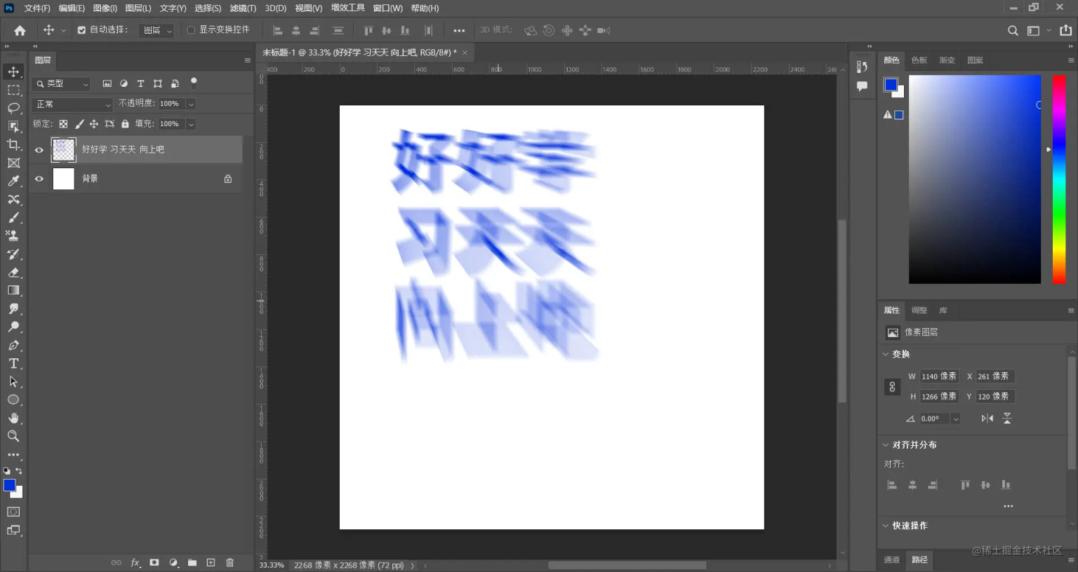 首先我们用蓝色字体写出九个大字“好好学习天天向上吧!”以每行三个字分三行排列,这里可以自己手绘,也可以打字,建议手绘,就算再丑的字是自己写的,也会有手写的感觉,电脑自带的预设字体可能打出来就会太生硬,有点参差感,还是对画面有好效果的,可以说字越丑就越有层次感。