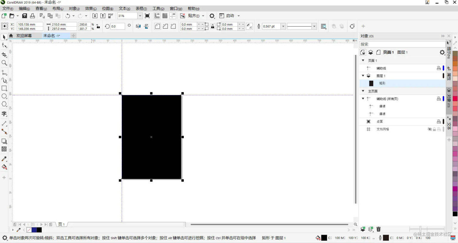 首先,我们新建一个大小为 210×297 的纸张随意画一个矩形,将它的长和宽改成这个数值,并且一到刚刚新建同样大小的画纸上填充纯黑,因为单毁会用到表格工具,表格工具的边缘也是黑色,所以我们会再填充一层其他颜色,可以复制这个图形把之前的黑色底锁定更改上面这个图层的颜色更改后依旧锁定