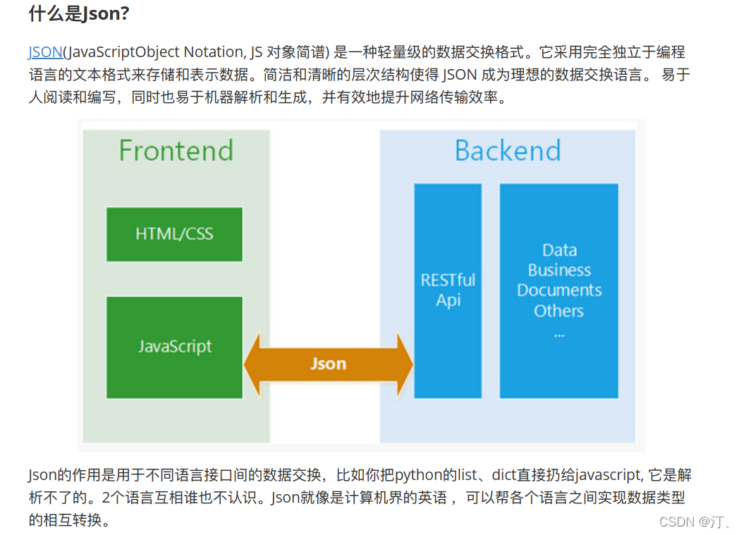 优点:跨语⾔言(不不同语⾔言间的数据传递可⽤用json交接)、体积⼩小