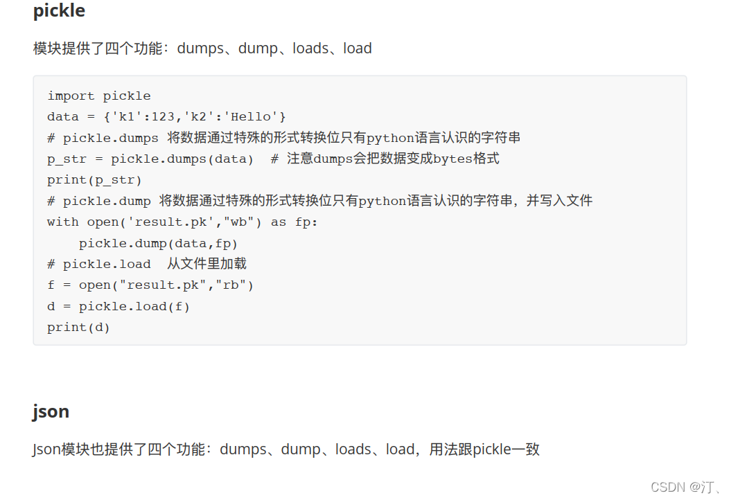 你打游戏过程中,打累了了,停下来,关掉游戏、想过2天再玩, 2天之后,游戏⼜又从你上次停⽌止的地⽅方继续运⾏行行,你上次游戏的进度肯定保存在硬盘上了了,是以何种形式呢?游戏过程中产⽣生的很多临时数据是不不规律律的,可能在你关掉游戏时正好有10个列列表, 3个嵌套字典的数据集合在内存⾥里里,需要存下来?你如何存?把列列表变成⽂文件⾥里里的多⾏行行多列列形式?那嵌套字典呢?根本没法存。所以,若是有种办法可以直接把内存数据存到硬盘上,下次程序再启动,再从硬盘上读回来,还是原来的格式的话,那是极好的。