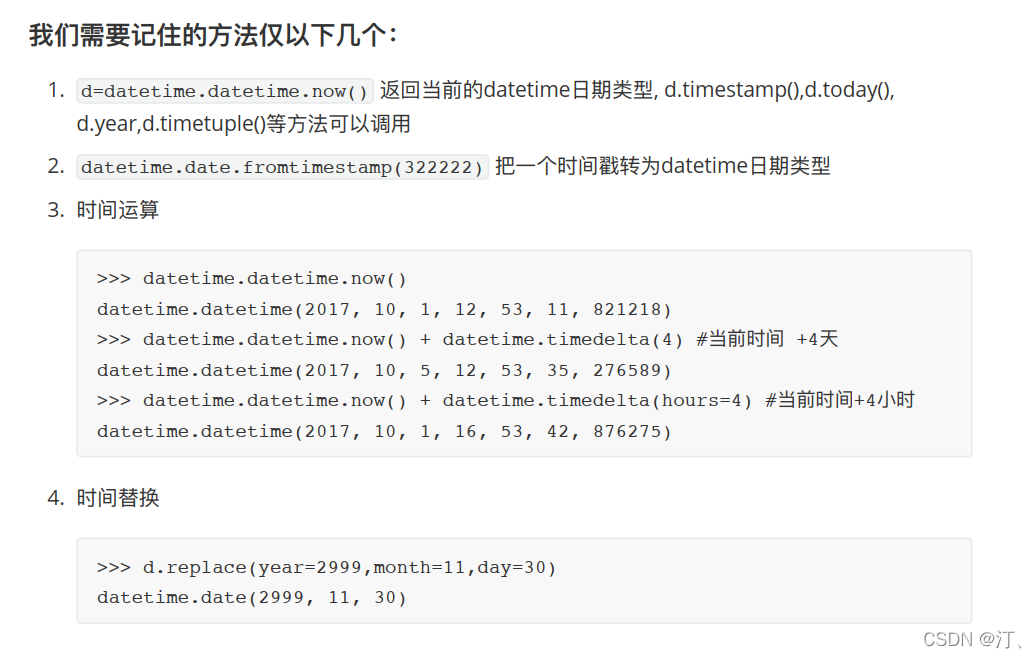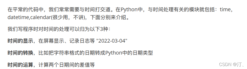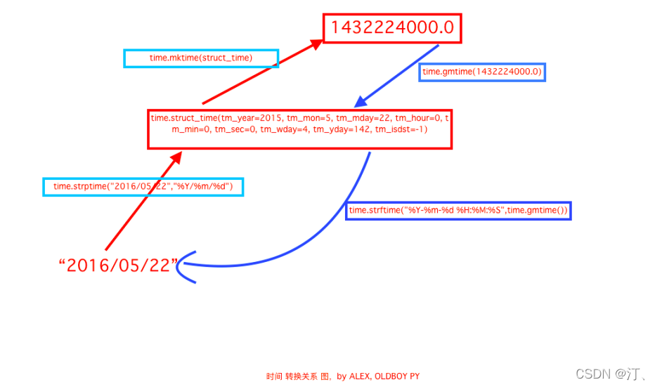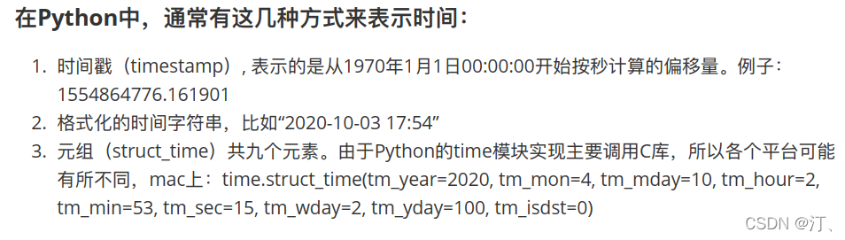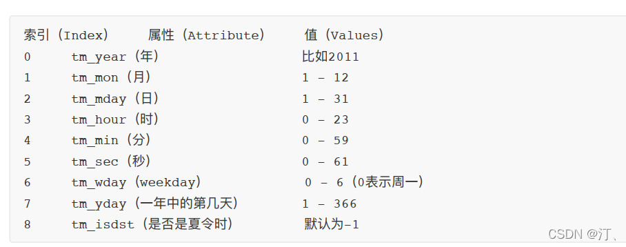 time.struct_time(tm_year=2022, tm_mon=4, tm_mday=10, tm_hour=13, tm_min=29, tm_sec=21, tm_wday=6, tm_yday=100, tm_isdst=0)●time.gmtime( secs) :和localtime(方法类似,gmtime()方 法是将一个时间戳转换为UTC时区
