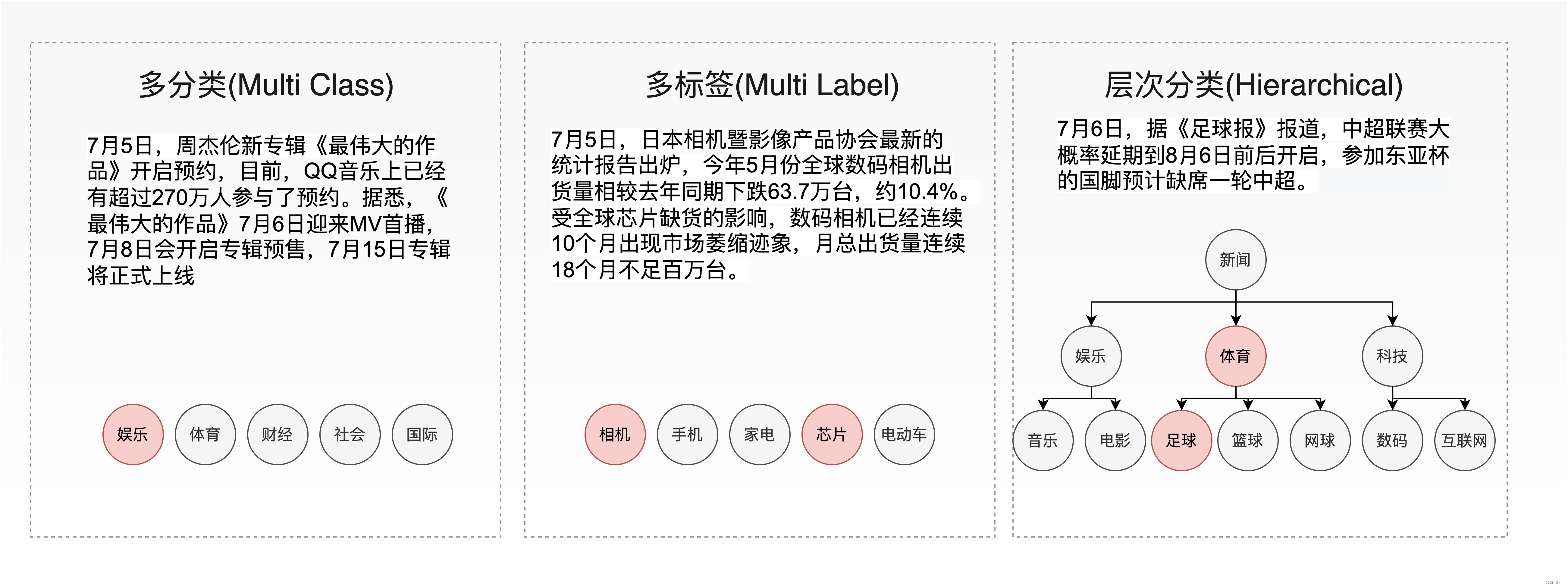 文本分类任务可以根据标签类型分为多分类(multi class)、多标签(multi label)、层次分类(hierarchical等三类任务,接下来我们将以下图的新闻文本分类为例介绍三种分类任务的区别。