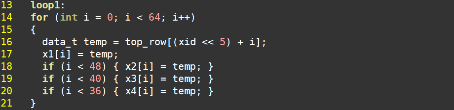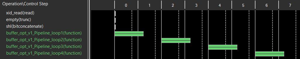 对于for循环,尽可能合并同边界for循环,涉及到if条件的,尽可能将if放在for循环之内。我们看一个案例,如下图所示,在不同边界条件下将读取数据赋值给不同的目标数组。这4个for循环是按顺序执行的,共消耗203个时钟周期(66+50+42+38)。从Schedule视图也能看到4个for循环的执行顺序。