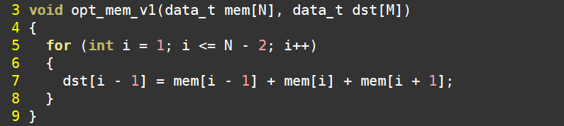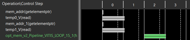 从微观来看,除了考虑数据位宽这一因素之外,还要考虑数组的访问方式。数组往往映射为RAM,而一个RAM最多提供两个输出端口,这意味着一个时钟周期最多读出两个数据。因此,对于数组的访问,我们尽可能做到减少访问次数提高读取数据的复用率。我们看下面这个案例。函数opt_mem_v1实现的是相邻三个数相加,这三个数来自于同一个数组。每次循环要从指定数组中读取3个数据。映射为RAM时,一个时钟周期内从同一个RAM中读出3个数据是难以实现的。从Schedule视图上也能看到RAM端口的局限性。为此,我们做如下改动,如函数opt_mem_v2所示,先从数组中读出0号地址和1号地址上的数据并将其赋给指定变量,这样每次循环只用从原始数组中读出一个新的数据而其他两个数据可以继承之前的输出结果,从而有效减少了数组的访问次数。
