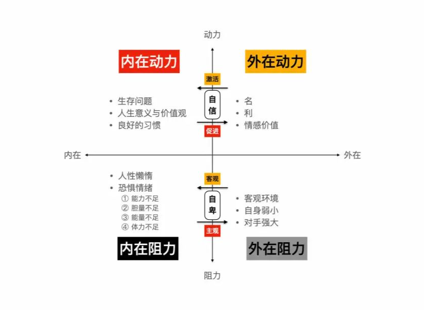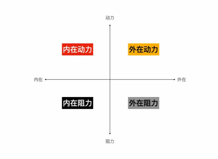我将动力与阻力分为内在动力、外在动力、内在阻力、外在阻力,正好是四个象限,见下图所示: