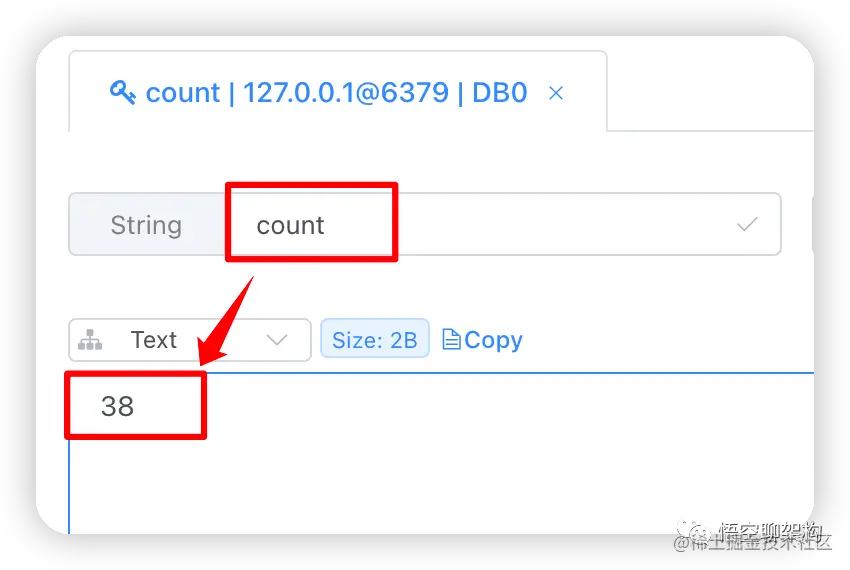然后到 Redis 中查看数据,count 的值也是递增后的值 38,也不是 null。