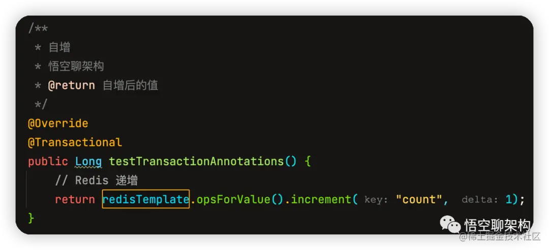 Service 实现类,定义了一个方法,用来递增 Redis 中的 count 键,每次递增 1,然后返回命令执行后的结果。而且这个 Service 方法加了@Transactional 注解。