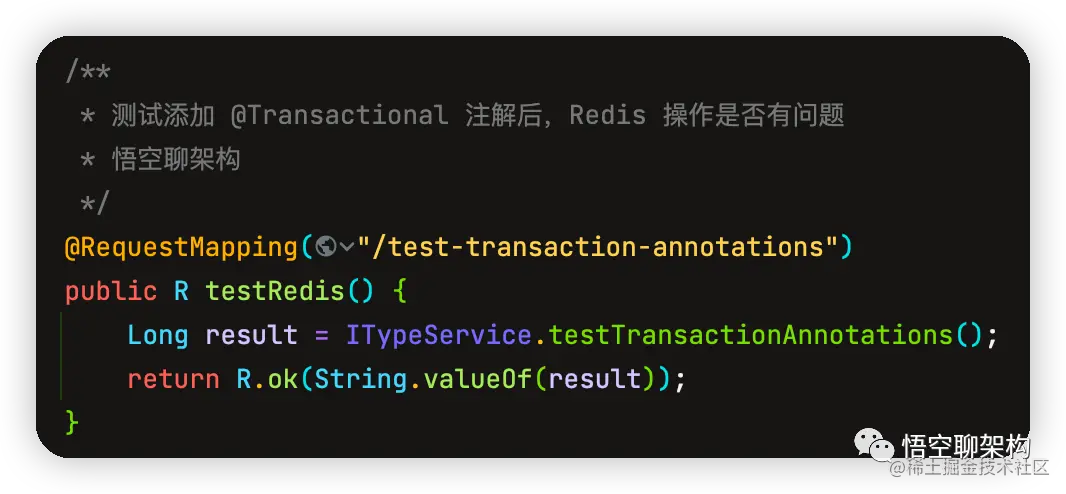 继续看代码,发现在操作 Redis 的 ServiceImpl 实现类的上面添加了一个 @Transactional 注解,推测是不是这个注解影响了 Redis 的操作结果。