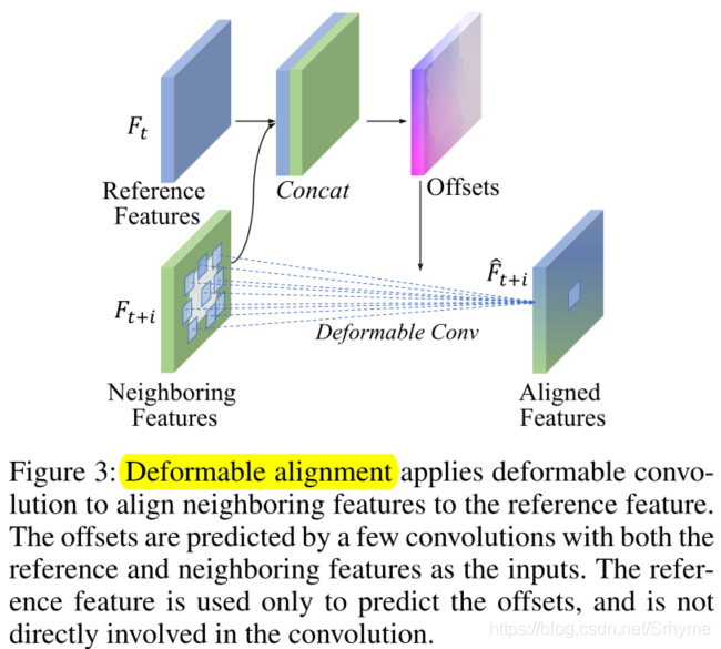 可变形对齐应用可变形卷积将相邻特征与参考特征对齐。以参考特征和相邻特征为输入,通过卷积来预测偏移量。参考特征仅用于预测偏移量,不参与后续卷积,TDAN中的可变性对齐如下图: