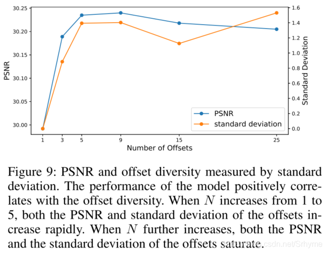 通过逐渐增加偏移量来检查性能增益,并尝试检查更多偏移量是否总能带来更好的性能。下图显示了不同N的定性比较。特别地,当偏移量从1增加到5时,PSNR迅速增加。当N进一步增加时,峰值信噪比饱和在30.23dB左右,模型的性能与偏移多样性呈正相关(基于这六个数据点,Pearson相关系数=0.9418)。这一结果表明,偏移多样性实际上有助于性能的提升。