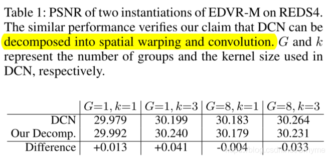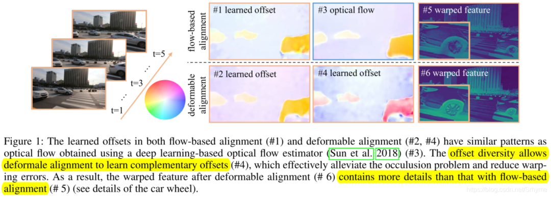 当n=1时相当于空间扭曲,然后是1×1卷积。在运动补偿的情境中,这种特殊情况等于光流对齐。换言之,可变形和基于流的对齐共享相同的公式,但偏移量数量不同。