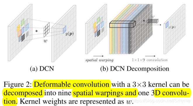 的标准三维卷积。如下图,核为3×3的可变形卷积可分解为9个空间扭曲和1个三维卷积。核权重用w表示。
