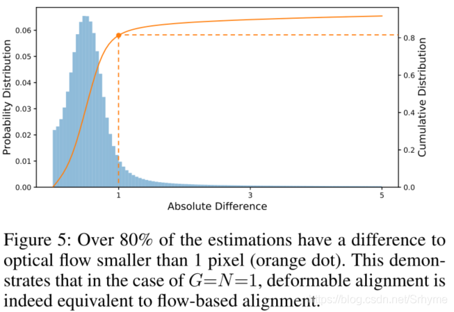 通过计算偏移量与光流的像素差,定量研究了偏移量与光流(PWC-Net)的相关性。如下图所示,超过80%的估计值与光流的差值小于一个像素。这表明,在G=N=1的情况下,可变形对齐实际上与基于流的对齐非常相似。