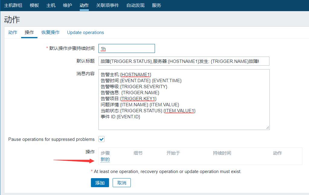 标题改为: 故障{TRIGGER.STATUS},服务器:{HOSTNAME1}发生: {TRIGGER.NAME}故障!