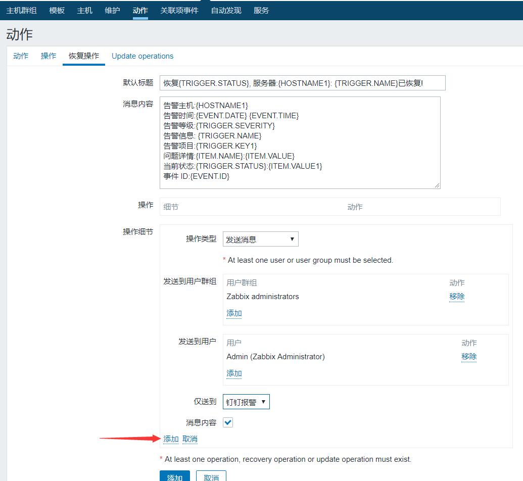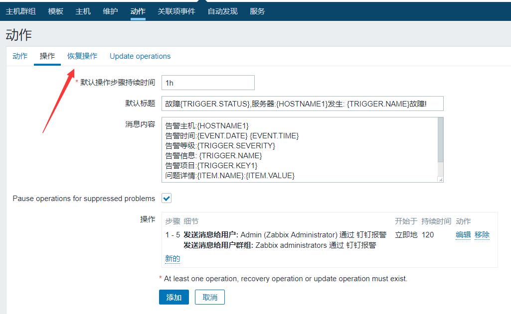 标题改为: 恢复{TRIGGER.STATUS}, 服务器:{HOSTNAME1}: {TRIGGER.NAME}已恢复!