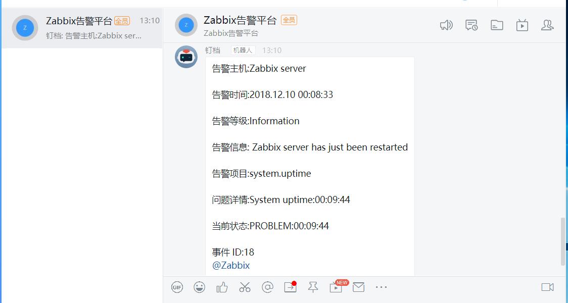 信息改为: 告警主机:{HOSTNAME1} 告警地址:{HOST.IP} 告警时间:{EVENT.DATE} {EVENT.TIME} 告警等级:{TRIGGER.SEVERITY} 告警信息: {TRIGGER.NAME} 告警项目:{TRIGGER.KEY1} 问题详情:{ITEM.NAME}:{ITEM.VALUE} 当前状态:{TRIGGER.STATUS}:{ITEM.VALUE1} 事件 ID:{EVENT.ID}